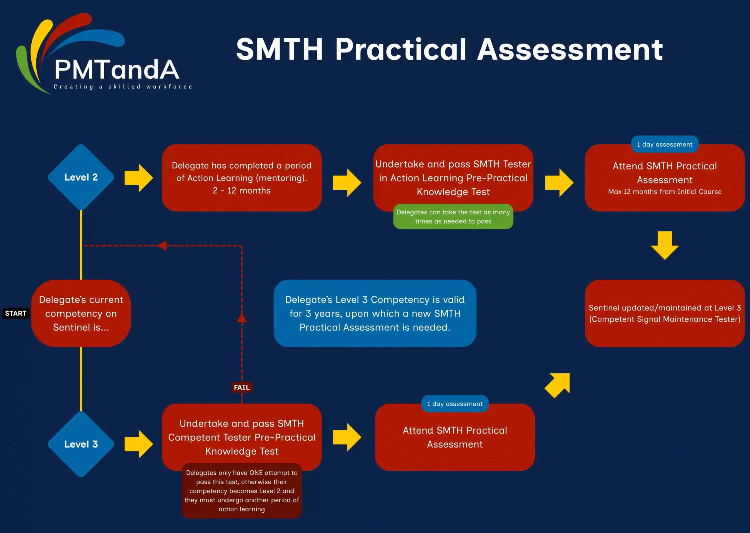 If the delegate fails this Pre-Practical Knowledge Test, their SMTH competencies will be marked down to Level 2, and in addition they will need to go through a period of Action Learning (mentoring) before attending another SMTH Practical Assessment. They will then follow the Level 2 Delegate route above.